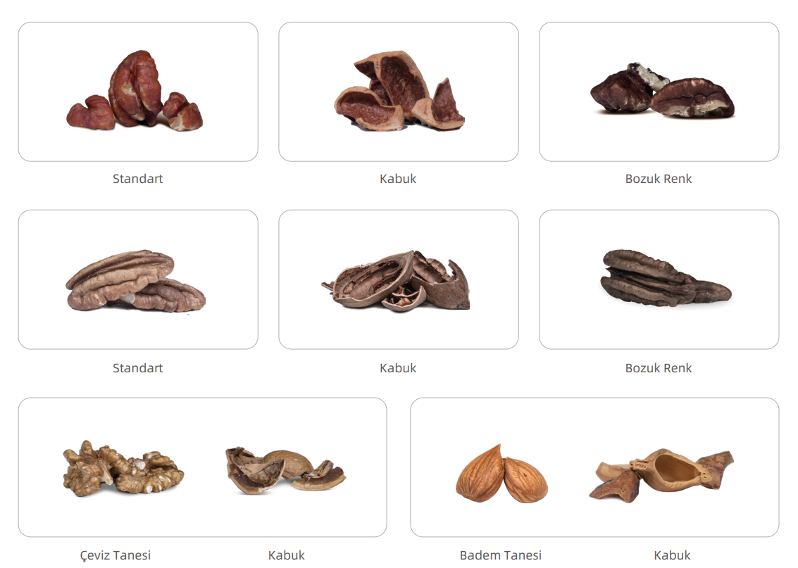 - İsteğe bağlı yapay zeka derin öğrenmeayıklama sistemi, fındık kabuğu ve çekirdeklerinin karıştığı ve benzer renklere sahip olduğu durumları temiz bir şekilde ayıklayabilir.